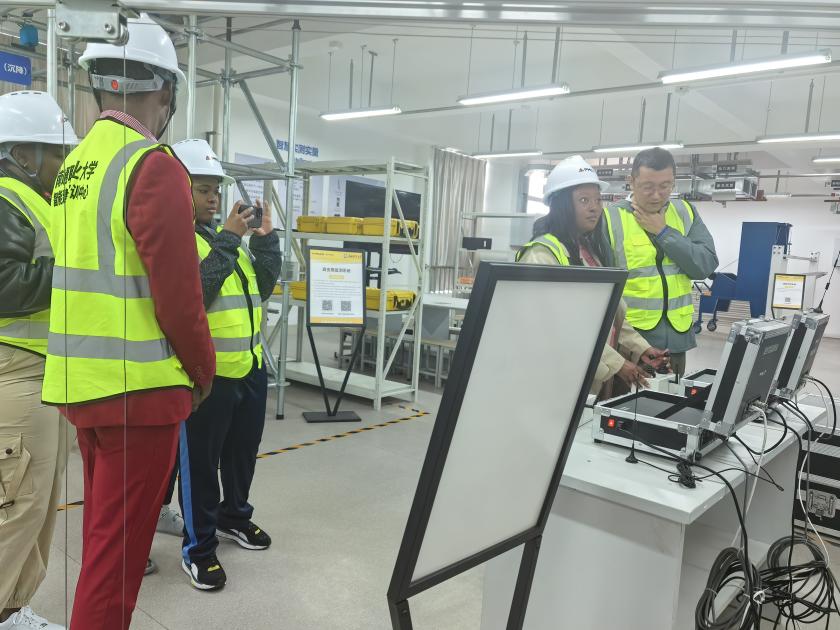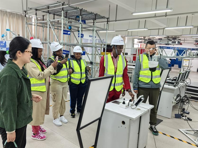 为强化认知,学院特别组织了实践教学基地参观活动。留学生们依次参观了智能建造实训基地、工程测量实训室和建筑信息模型实训中心。在智能建造实训基地,同学们亲眼目睹了塔式起重机安全监控系统、自动喷涂系统等的操作,并亲手尝试操作,表现出浓厚的兴趣。
