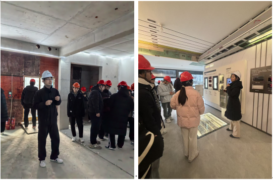 校外现场参观环节,学子们走出校园,走进真实工程场景与专业机构,实现理论与实践的深度衔接。在臻如府在建项目现场,工程师带领大家观摩主体结构施工、机电管线排布等关键工序,详细讲解施工组织设计、安全防护措施及质量管控要点,样板房内的空间布局、装饰细节与人性化设计,让学子们对建筑功能与美学融合有了具象认知。
