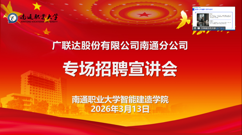 此次线上专场招聘会是智能建造学院深化“访企拓岗”专项行动的重要举措,此前学院与广联达南通分公司,就人才培养标准、课程体系优化、实践教学基地建设等议题达成初步合作共识,为此次专场招聘的顺利开展奠定了坚实基础。